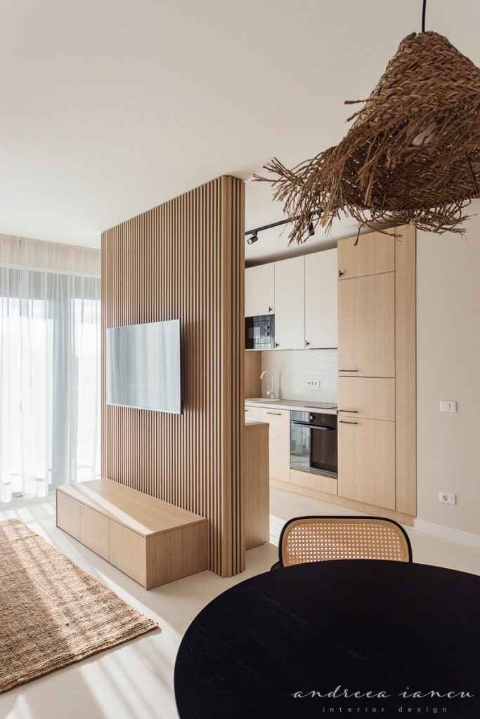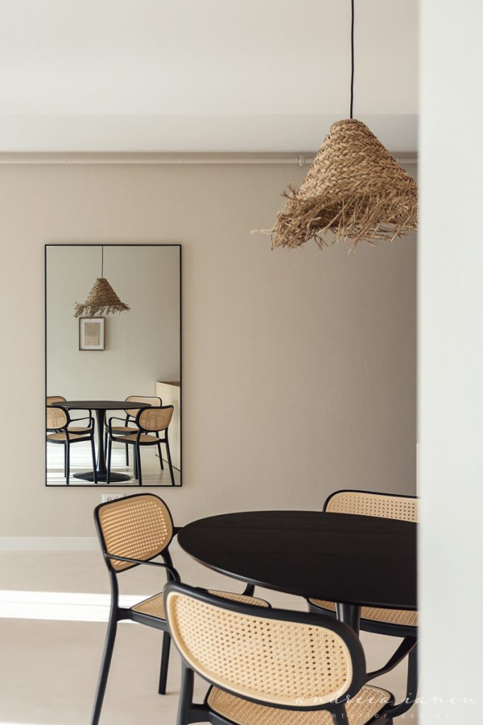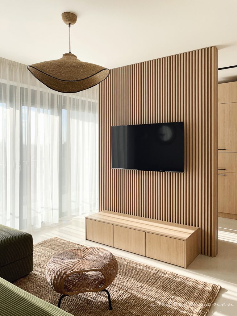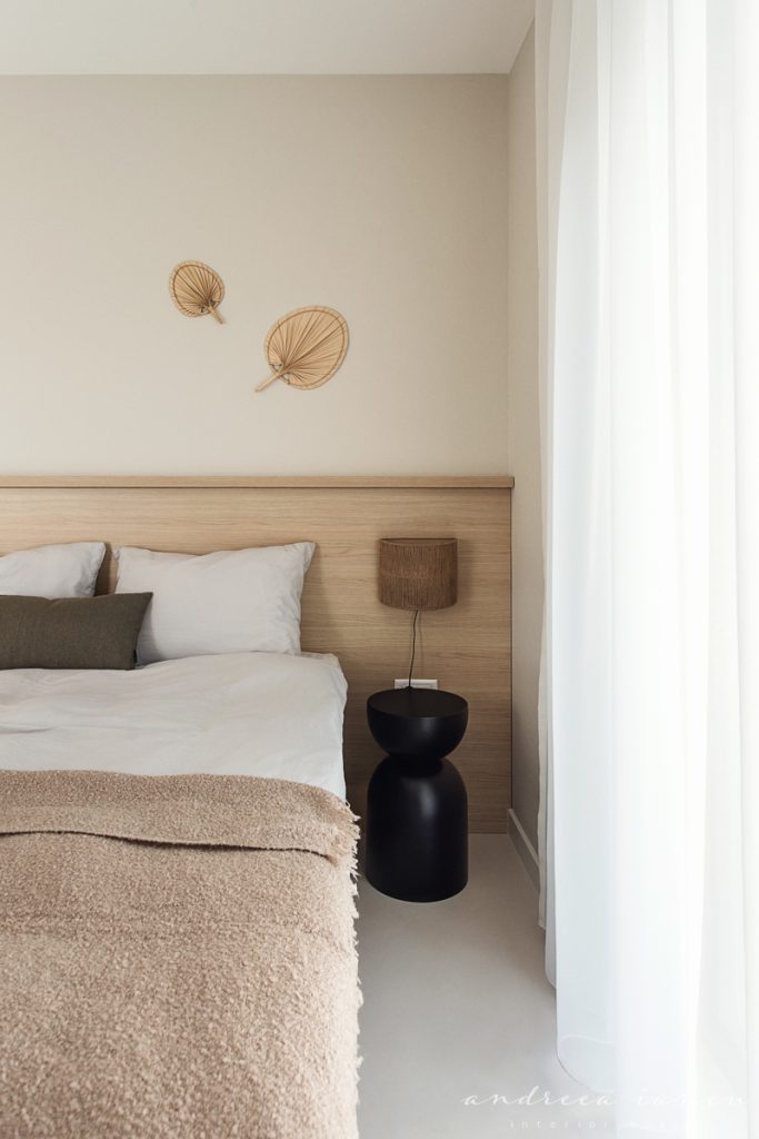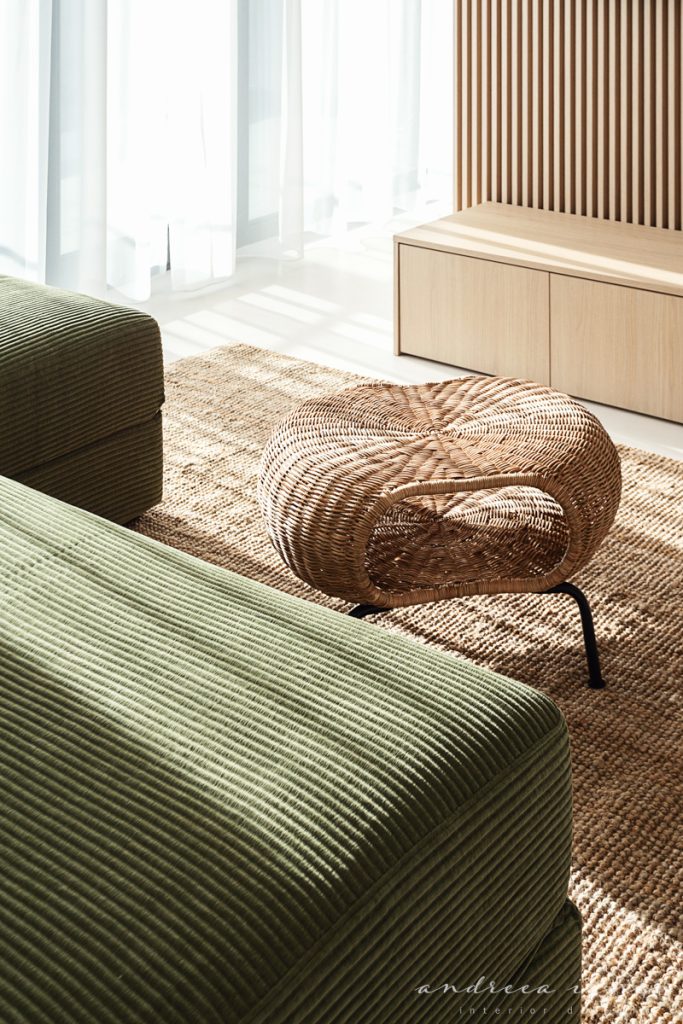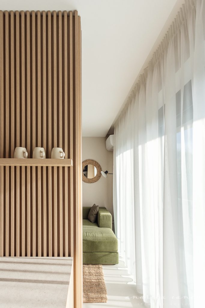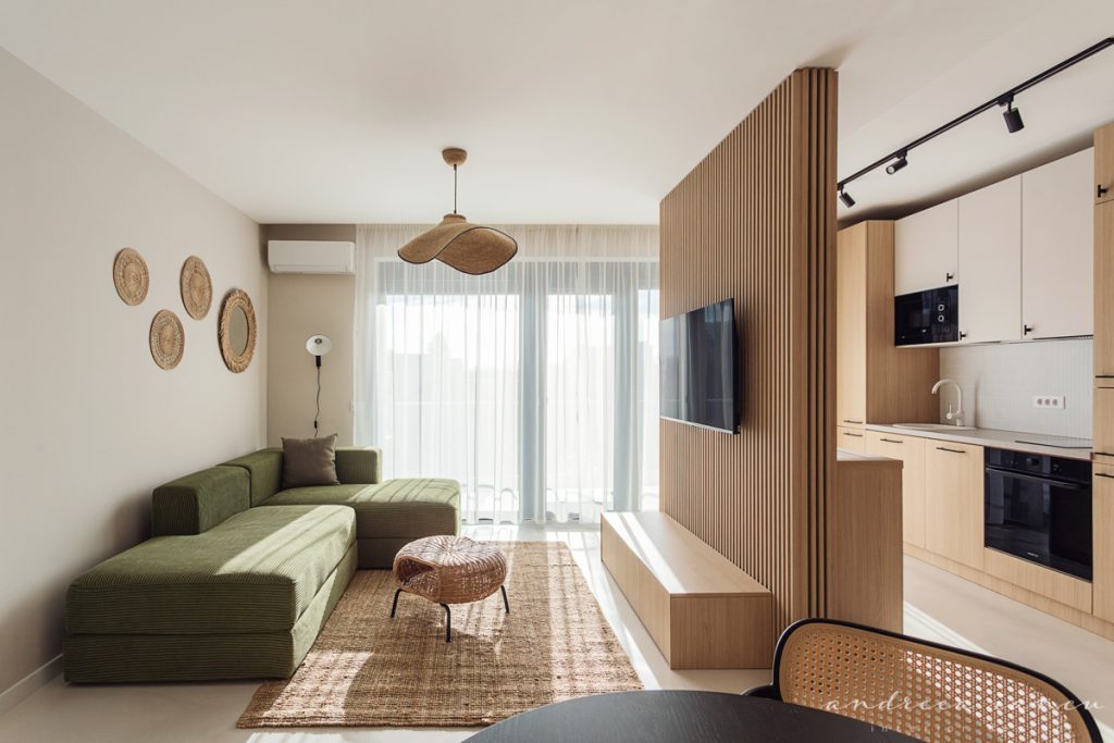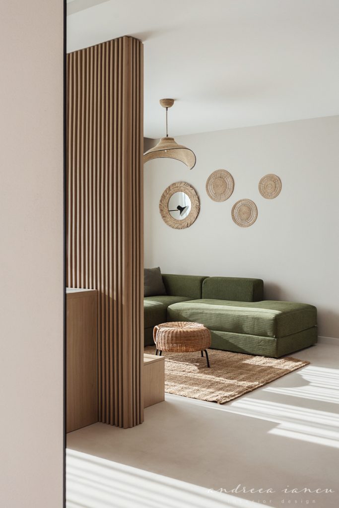 As for the looks and atmosphere, we chose a light sand-colored microcement floor throughout the whole apartment for unity and enhance the feeling of a larger space. Wood texture was used to add warmth, combined with natural materials like jute and wicker for a relaxed, summery, beach-inspired feel.