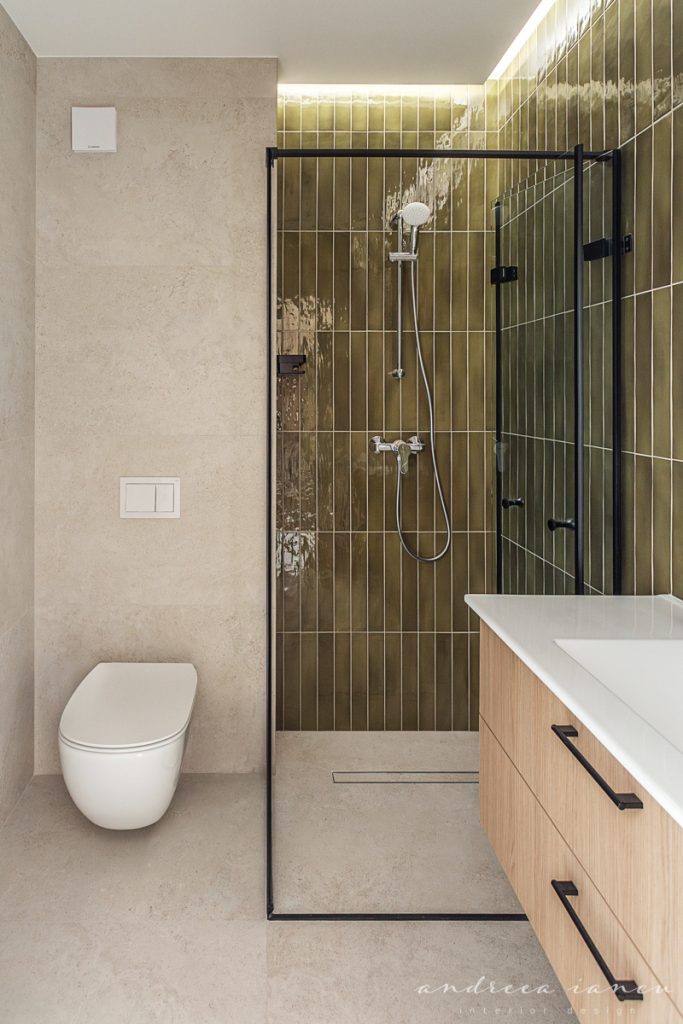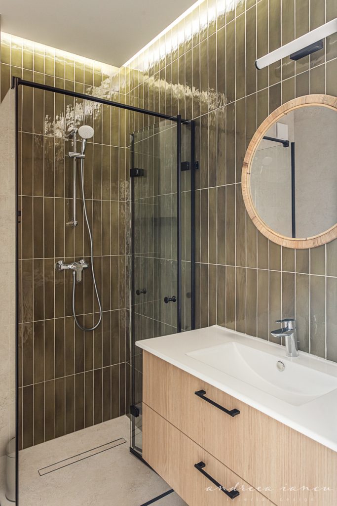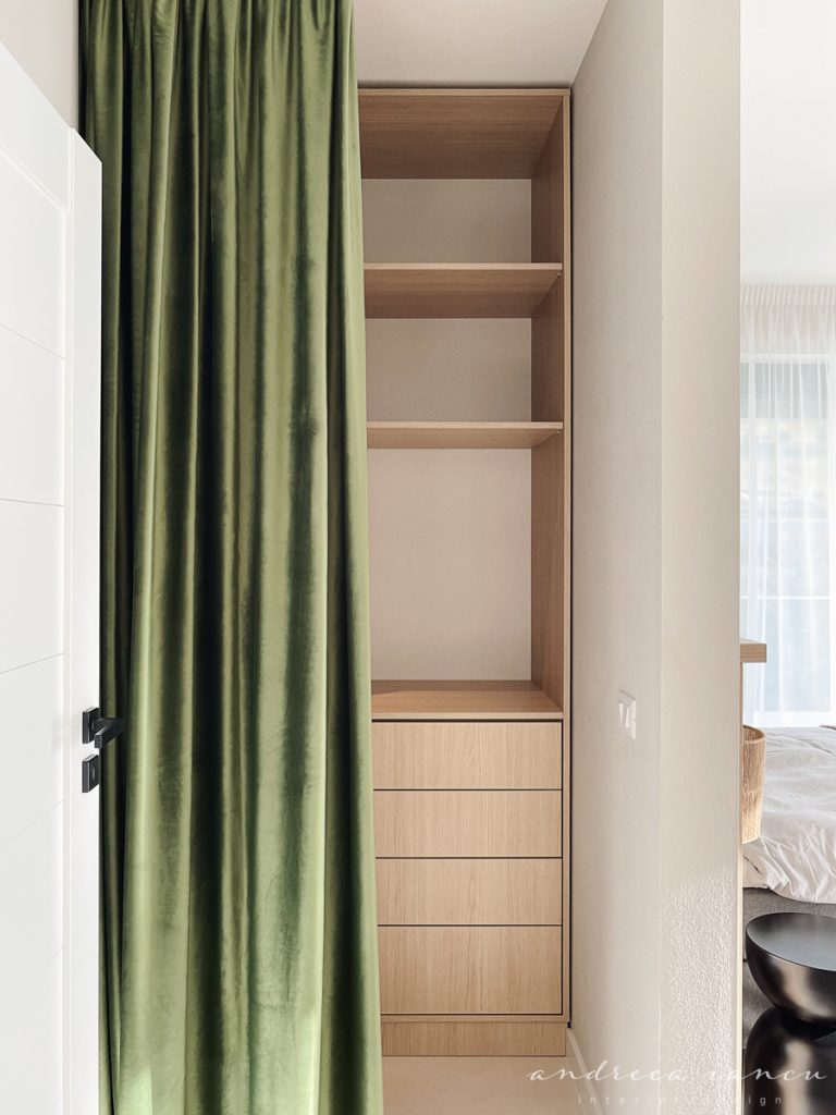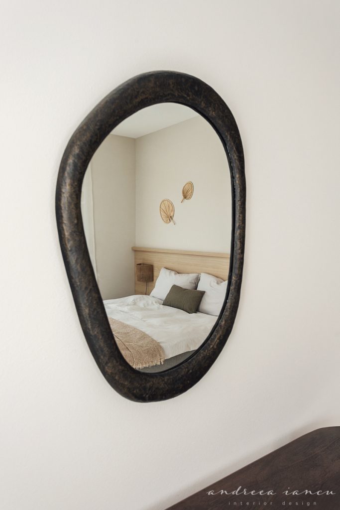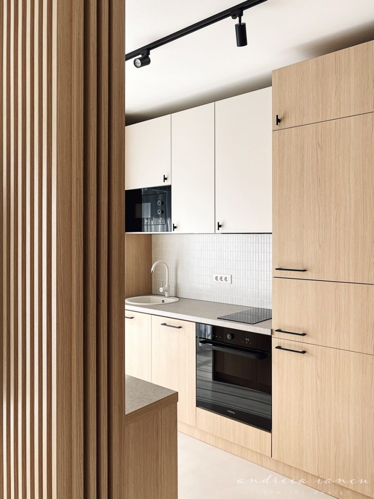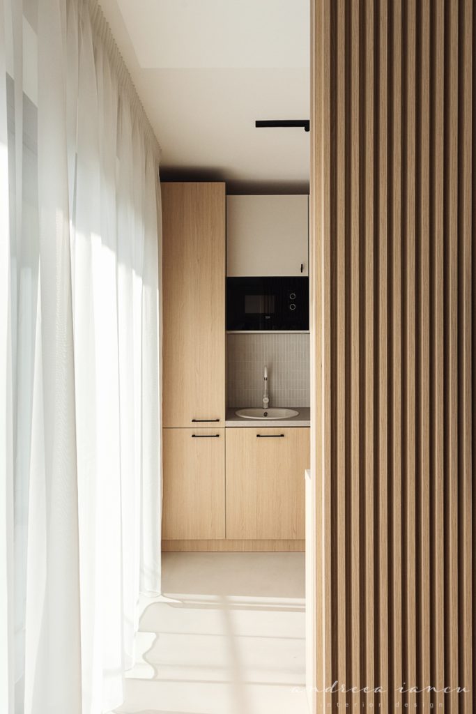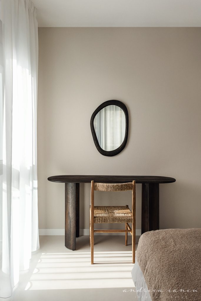 As for the looks and atmosphere, we chose a light sand-colored microcement floor throughout the whole apartment for unity and enhance the feeling of a larger space. Wood texture was used to add warmth, combined with natural materials like jute and wicker for a relaxed, summery, beach-inspired feel.