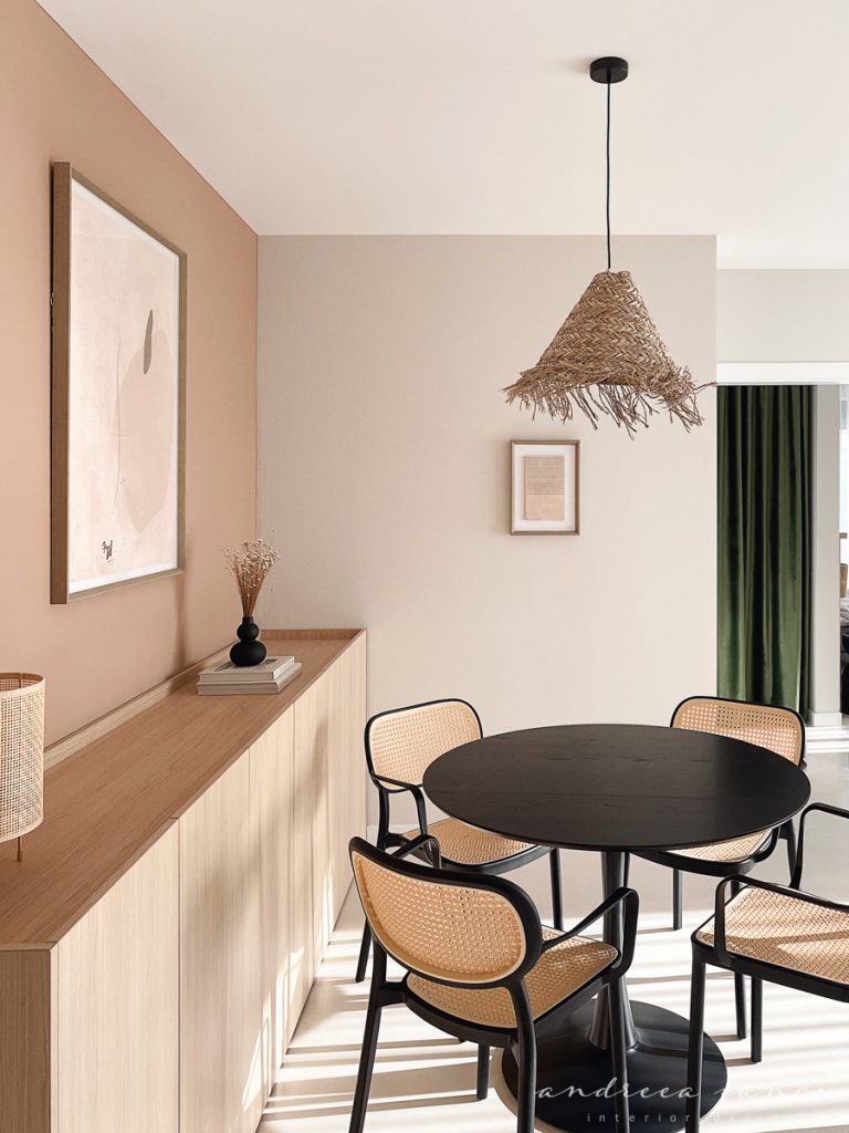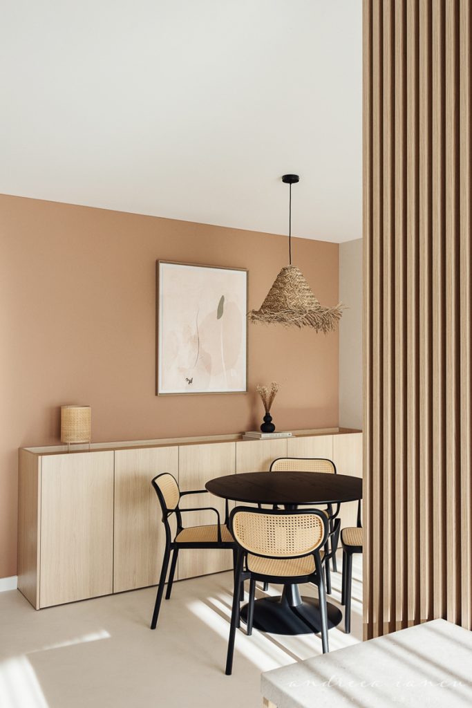 - Second, we proposed a much smaller dining table for up to 4-5 persons, in a rounded shape that fits perfectly in its new location without interrupting circulation. We opted for a fixed table, but it can surely be replaced by an extendable model if needed. Relocating the table and changing its size and shape allowed us to integrate a slim storage unit along the wall, which also discreetly conceals the underfloor heating control panel, while remaining easily accessible.